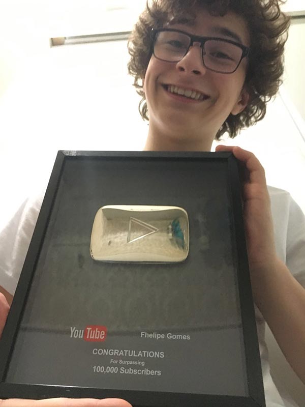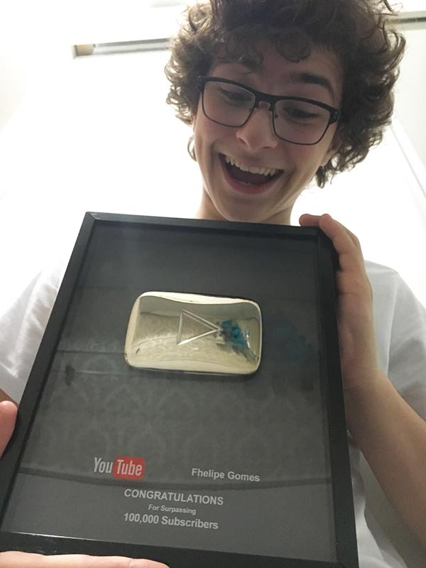 Nesta terça, 12 de julho, o ator Fhelipe Gomes, o Téo em Cúmplices de Um Resgate, foi presenteado pelo YouTube com a tão sonhada placa de PRATA, que representa 100 mil inscritos no canal. Olha só: