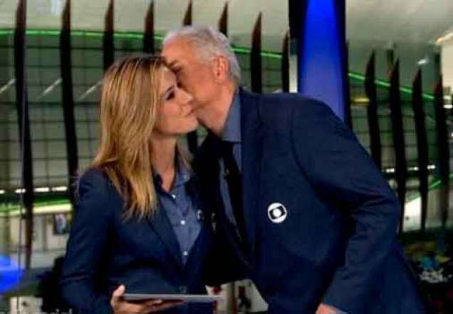 Enquanto eles comemoram, Waack entra na sala: "Ah, não, para", diz a apresentadora, aos risos. Os dois, então, se abraçam como velhos amigos.