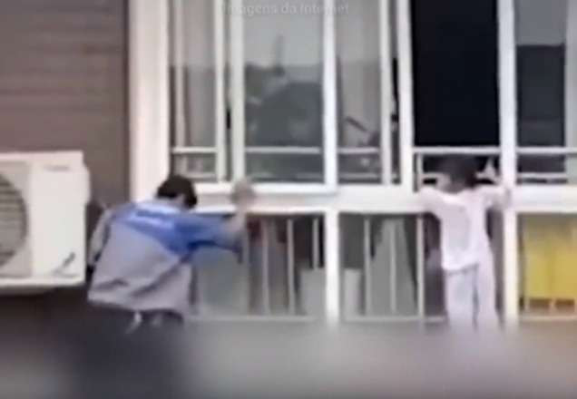 Apesar do susto, o homem consegue colocar a menina para o lado de dentro e também passa pela janela.