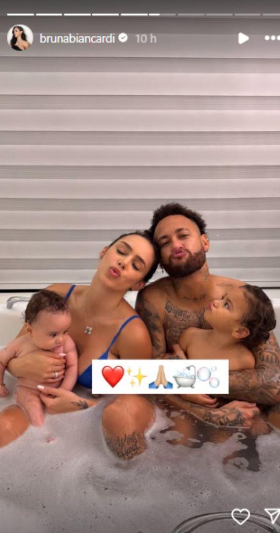Neymar Jr surgiu em um momento íntimo e cheio de carinho ao lado da família. Em uma foto publicada por Bruna Biancardi, o jogador aparece na banheira com as filhas, Mel e Mavie, durante um banho de espuma.