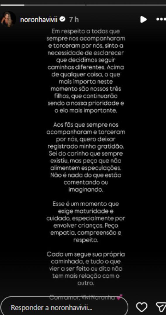 "Em respeito a todos que sempre nos acompanharam e torceram por nós, sinto a necessidade de esclarecer que decidimos seguir caminhos diferentes. Acima de qualquer coisa, o que mais importa neste momento são nossos três filhos, que continuarão sendo a nossa prioridade e o elo mais importante", informou Vivi.