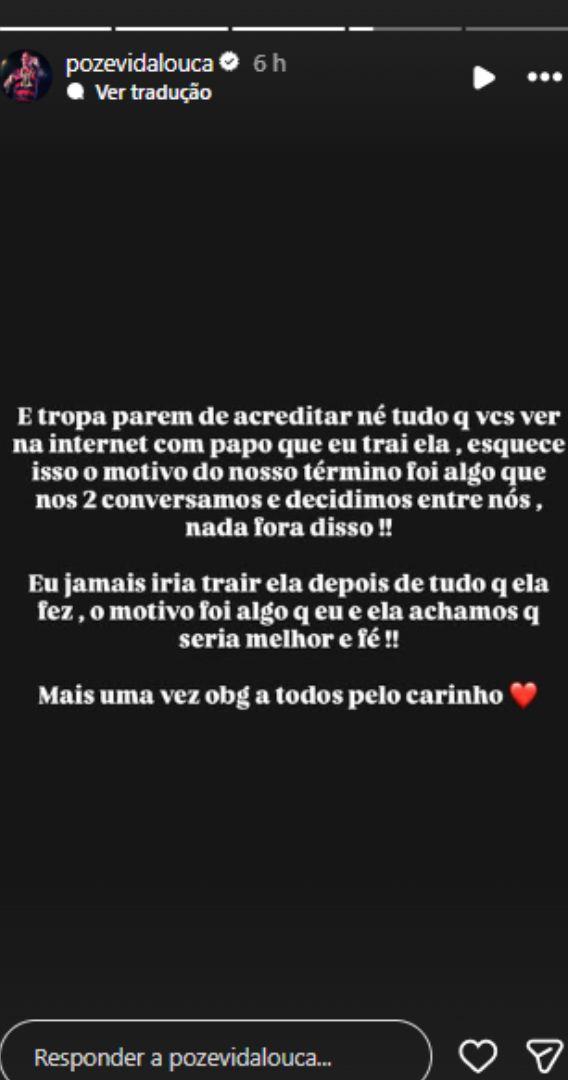 Além disso, Poze também se pronunciou em suas redes sociais para negar que o término tenha sido motivado por uma traição.