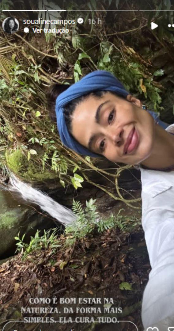 "Isso é Deus", escreveu a atriz ao aparecer de biquíni azul entrando na queda-d?água, onde se banhou por completo. No trajeto até o local, Aline registrou a trilha pela mata e refletiu: "Como é bom estar na natureza da forma mais simples. Ela cura tudo."