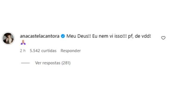 A repercussão foi tão grande que muitos usuários correram para ver o vídeo e tentar entender o que havia acontecido. Minutos depois, com a polêmica instaurada, Ana Castela usou as redes sociais para se pronunciar e afirmou não ter percebido o repost. "Meu Deus!! Eu nem vi isso! Por favor, de verdade!", escreveu a cantora.
