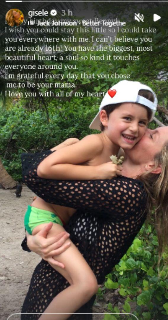 Gisele Bündchen apareceu em seus stories para desejar feliz aniversário ao filho Benjamin, fruto do relacionamento com o jogador de futebol americano Tom Brady.