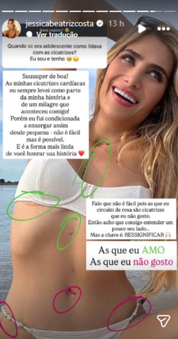A influenciadora publicou também uma foto mostrando as cicatrizes, indicando quais gosta e quais não: "Falo que não foi fácil, pois as que circulei de rosa são cicatrizes que eu não gosto. Então acho que consigo entender um pouco seu lado? Mas a chave é ressignificar", respondeu para o internauta, que afirmou não gostar das próprias cicatrizes na pergunta para Jéssica. Segundo ela, enxergar essas marcas de outra forma é um caminho possível para lidar com as próprias narrativas de saúde.