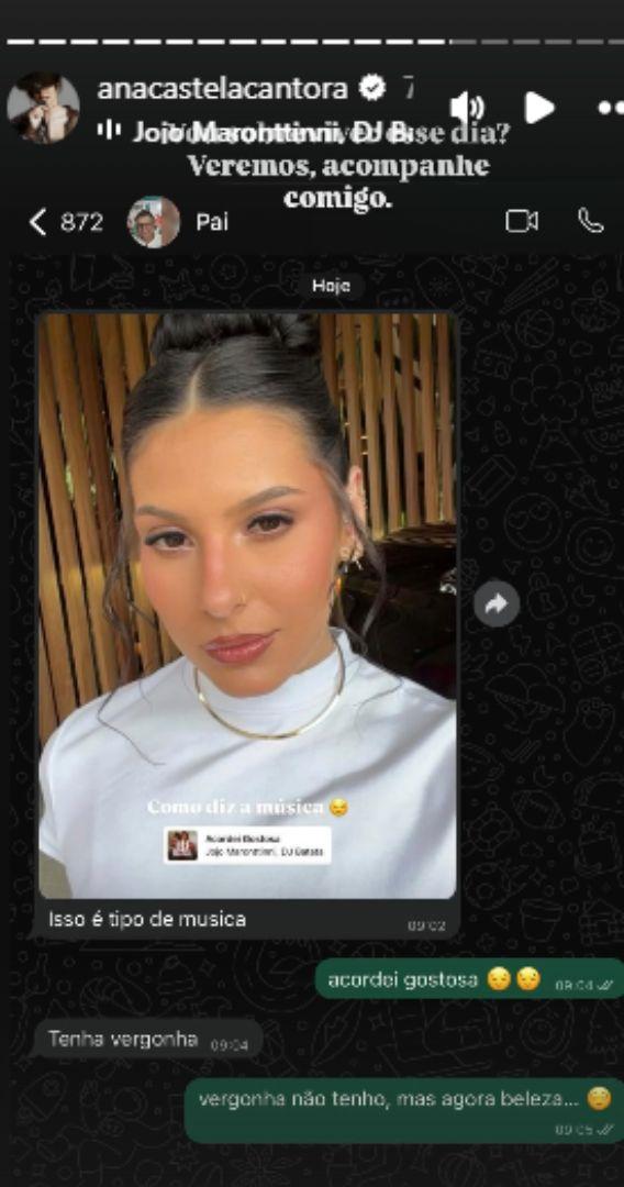 Nos stories seguintes, Ana compartilhou um print da mensagem que recebeu dele. Nas mensagens, ele enviou a foto e escreveu: "Isso é tipo de música?". Prontamente, a cantora rebateu: "Acordei gostosa." O pai respondeu de imediato: "Tenha vergonha." Ana continuou a conversa com mais uma farpa, dizendo: "Vergonha não tenho, agora beleza..."