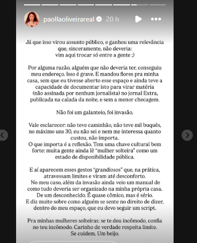 "E aí aparecem esses gestos 'grandiosos' que, na prática, atravessam limites e viram até desconforto.No meu caso, além da invasão, ainda veio um manual de como tudo deveria ser organizado na minha própria casa. De um desconhecido. É quase cômico, mas é sério. E diz muito sobre como alguém se sente no direito de dizer, dentro do meu espaço, que eu devo seguir um script. Pra minhas mulheres solteiras: se te deu incômodo, confia no teu incômodo. Carinho de verdade respeita limite.Não foi um galanteio. Foi invasão", escreveu.