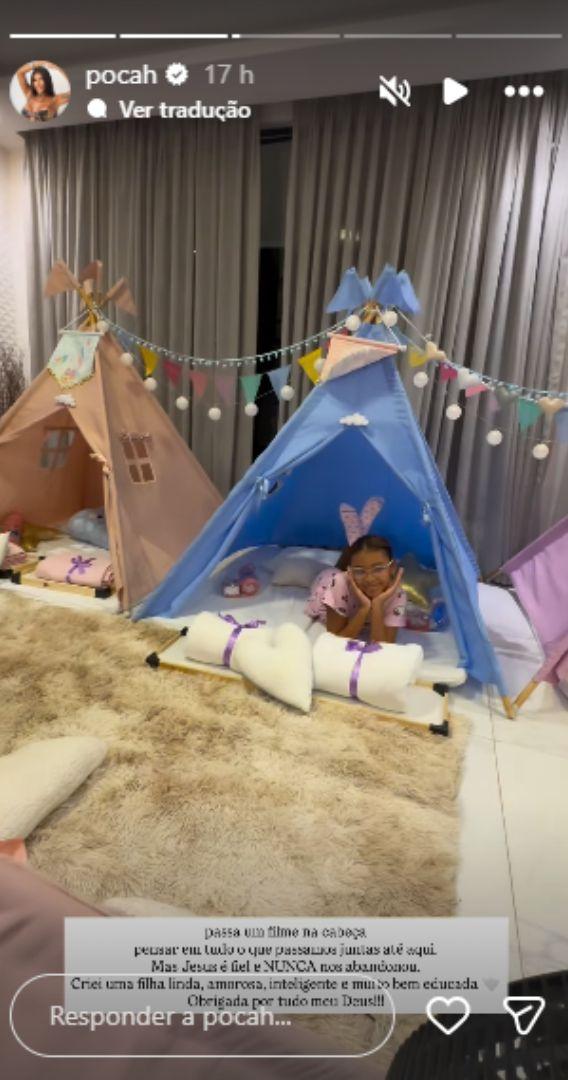 Em um dos momentos compartilhados, mãe e filha aparecem juntas em clima de carinho, acompanhadas da frase: "Tudo por você, meu amor". Pocah também refletiu sobre a trajetória das duas. "Passa um filme na cabeça. Pensar em tudo o que passamos juntas até aqui. Mas Jesus é fiel e nunca nos abandonou. Criei uma filha linda, amorosa, inteligente e muito bem educada. Obrigada por tudo, meu Deus", escreveu.