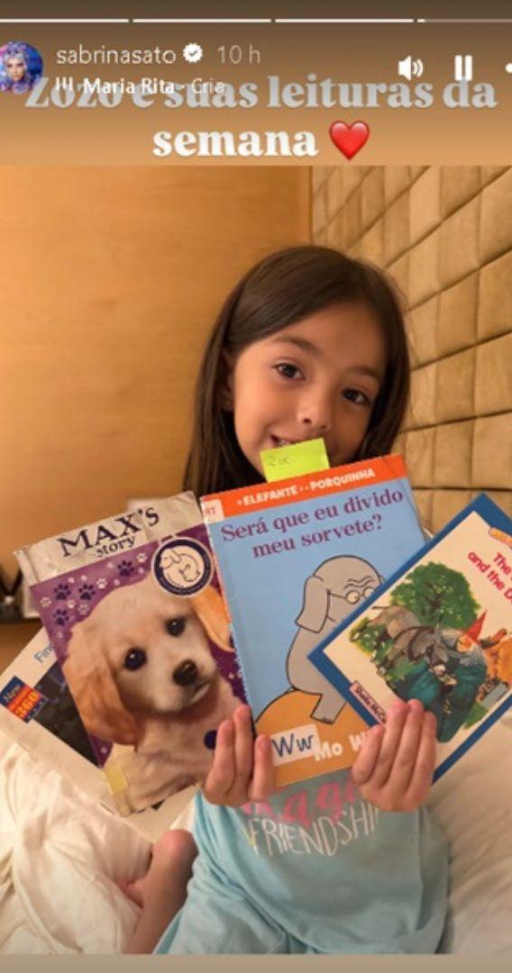 Em uma publicação nas redes sociais, Zoe aparece segurando quatro livros escolhidos para os próximos dias. Orgulhosa do interesse da filha pela leitura, Sabrina escreveu na legenda: "Zozo e suas leituras da semana".