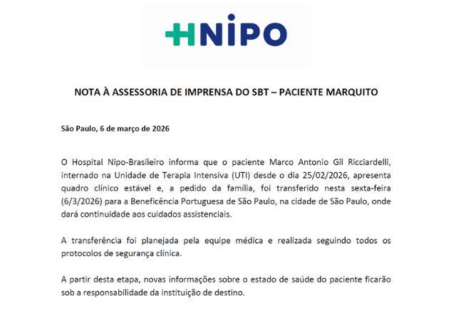 O humorista Marquito foi transferido de hospital na noite de quinta-feira (6), às 22h55, para dar continuidade ao tratamento médico em São Paulo. A informação foi confirmada por meio de comunicado oficial divulgado pela equipe do artista.