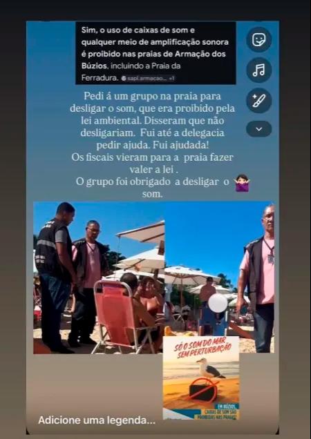 "Pedi a um grupo na praia para desligar o som, que era proibido pela lei ambiental. Disseram que não desligariam. Fui até a delegacia pedir ajuda. Fui ajudada! Os fiscais vieram para a praia fazer valer a lei. O grupo foi obrigado a desligar o som", disse no Instagram.