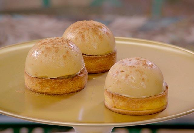 Posicione sobre uma tartelette assada, recheada com banana (passe o suco de limão para não oxidar);