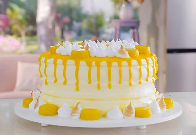 10. Posicione os quindins na lateral e no topo do bolo, sendo 10 na lateral e 8 no topo. Em seguida, complete com os picos de merengue que não são maçaricados.