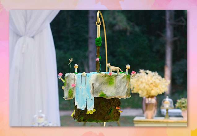 Este bolo possui uma decoração feita com pasta americana