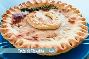 Colocar um dos discos da massa no fundo da torta e pré assar em forno a 200C por 15 minutos. Preencher com o recheio frio, cobrir com o outro disco de massa. Decorar abrindo buracos na massa para o vapor do recheio sair durante o cozimento. Assar por 35-45 minutos em forno a 200C.