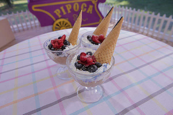 Retire o recheio da geladeira e separe 1 xícara (chá) para a cobertura. Divida o restante do recheio em 2 partes iguais e reserve. Com uma faca, corte o bolo em 3 discos no sentido da largura. Coloque um disco no centro de um prato e, com o auxílio de um saco de confeiteiro, cubra totalmente este disco de massa com uma camada de recheio. Faça o mesmo com o outro disco de massa. Cubra com o último disco de massa e decore o bolo com a xícara (chá) de recheio reservada. Decore com frutas vermelhas e sirva em seguida.