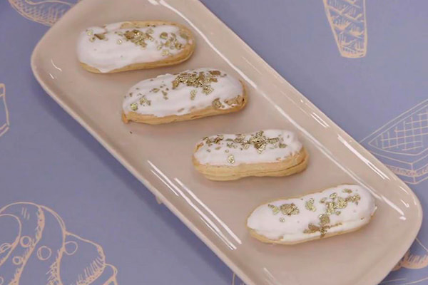Derreta o chocolate e coloque o corante amarelo até atingir a cor desejada. Mergulhe a parte superior da éclair e decore com o folhado dourado.