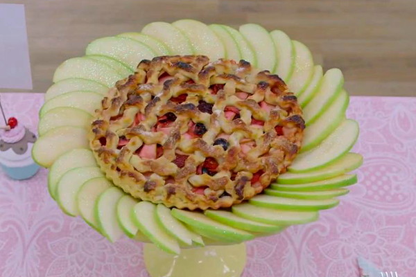 Pegue as fatias trançadas no freezer, coloque em cima da torta e pincele-as com gema. Em seguida, jogue um pouco de açúcar em cima. Leve ao forno por 50 minutos a 200 graus já pré-aquecido.