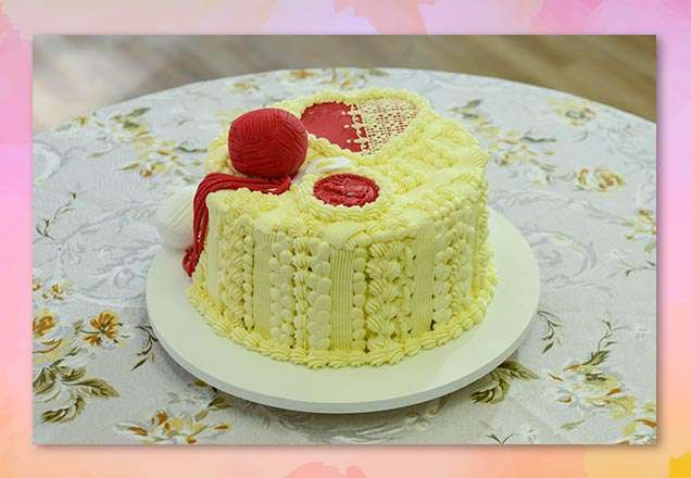 9 – Prepare o glace e cubra o bolo fazendo acabamento com bicos estrela e perle imitando trico.