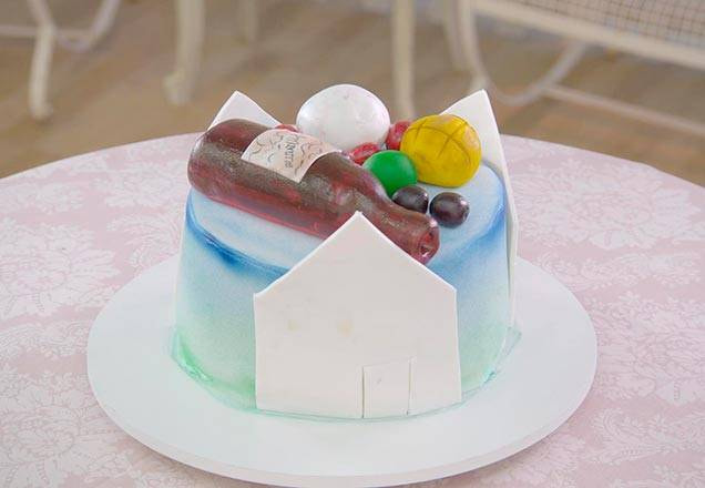 Colar os moldes na lateral do bolo real, esfumaçar folhagens lembrando videira, em cima do bolo, no canto, colar a toalha e em cima dela colocar cesta de pães e azeitonas e azeite. Ao lado da porta do bolo fake, colar o vaso retangular.