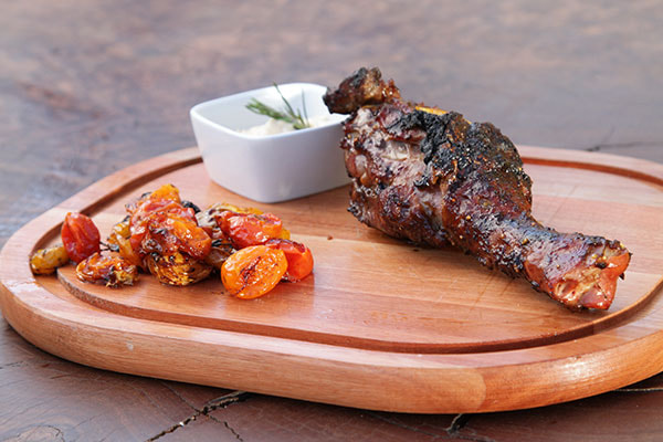 Temperar a coxa com sal, pimenta, manteiga, tomilho e alecrim, fatias da metade da laranja e páprica. Injetar na carne. Cozinhar no pit por 50 minutos a 150°C, pincelando o molho barbecue.
