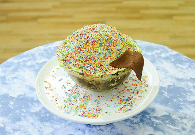 Com uma espátula, espatular o chantily verde na base, após esse processo com colher detalhar a decoração.