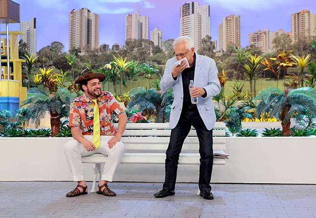 Logo no início do bate-papo, o humorista apareceu com uma garrafa de água e ofereceu para Cazalbé, com a conversinha de ele precisava se hidratar e tal. Quando o apresentador começou a beber, veio a piada. Aí não teve escapatória, ele cuspiu e quase engasgou de tanto rir.